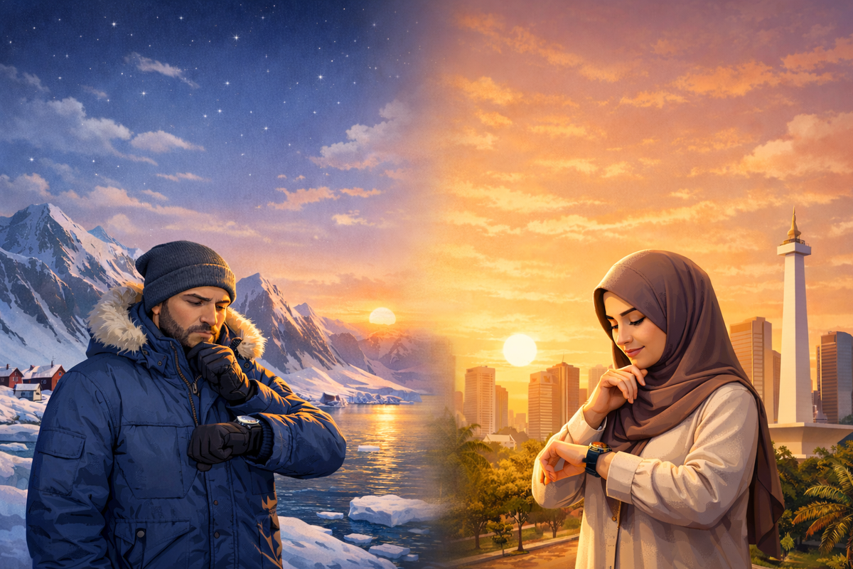 Dalam kondisi demikian, sebagian mengikuti jadwal kota terdekat dengan durasi lebih moderat atau menggunakan waktu Kota Makkah sebagai acuan.
