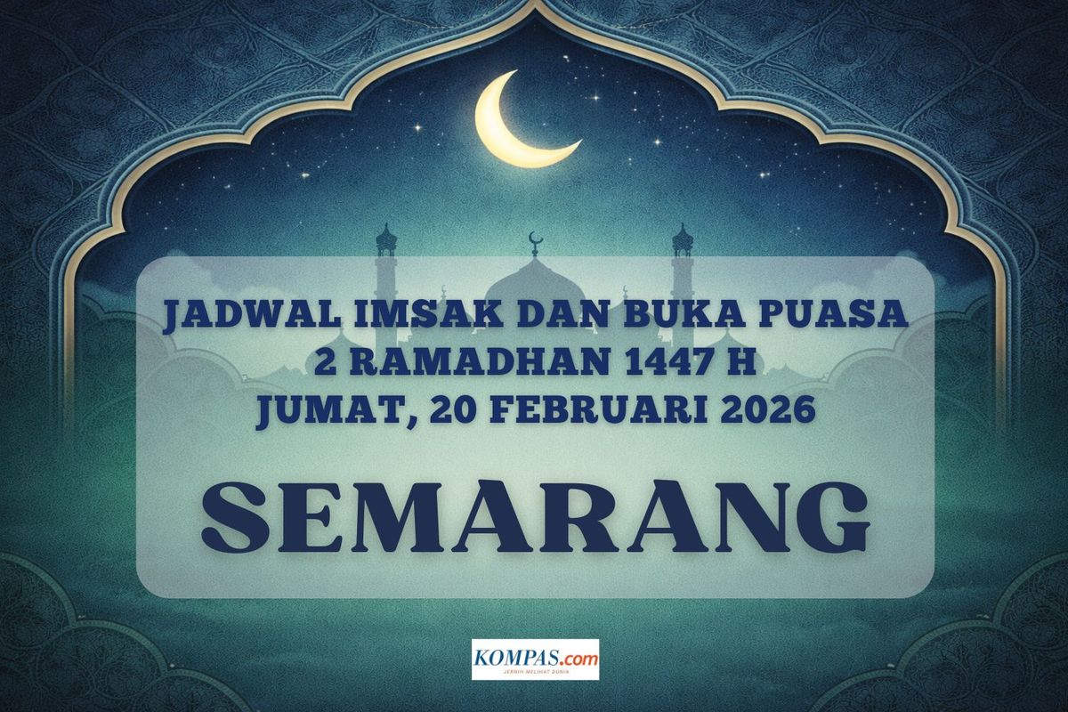 KOMPAS.com - Berikut jadwal imsak dan buka puasa Ramadhan 2026 di Kota Semarang hari ini, 20 Februari 2026 atau 2 Ramadhan 1447 H.