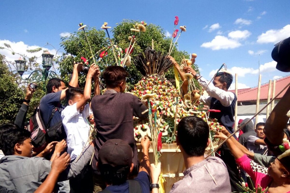 Gunungan hasil bumi diarak dan kemudian diperebutkan masyarakat. Dalam perspektif antropologi budaya, tradisi ini mencerminkan konsep redistribusi kesejahteraan raja sebagai simbol kekuasaan berbagi berkah kepada rakyatnya.