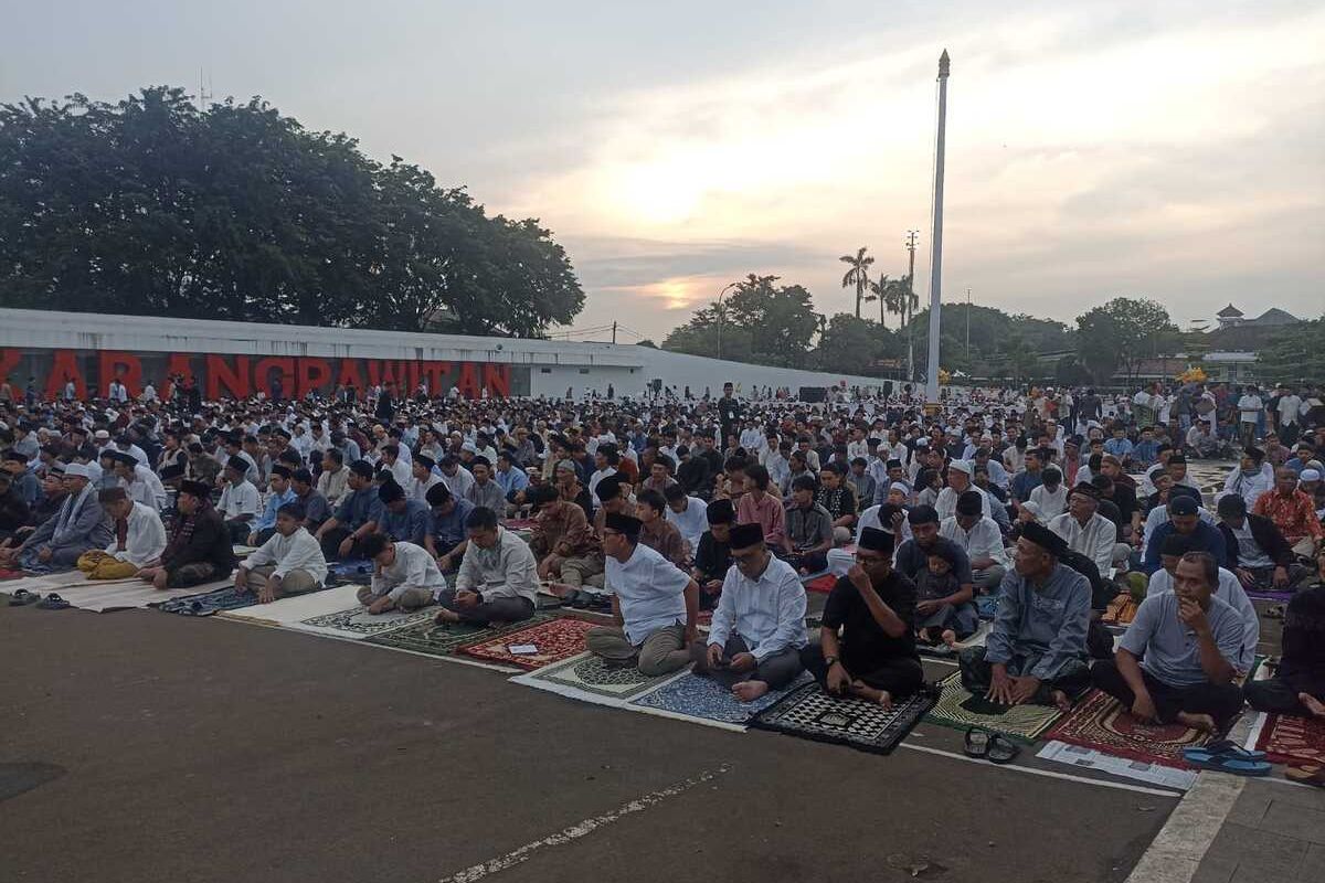 KARAWANG, KOMPAS.com-Ribuan warga mengikuti Lapangan Karangpawitan, Karawang Barat, Kabupaten Karawang, Sabtu (21/3/2026), untuk melaksanakan shalat Idul Fitri 1447 Hijriah atau 2026.