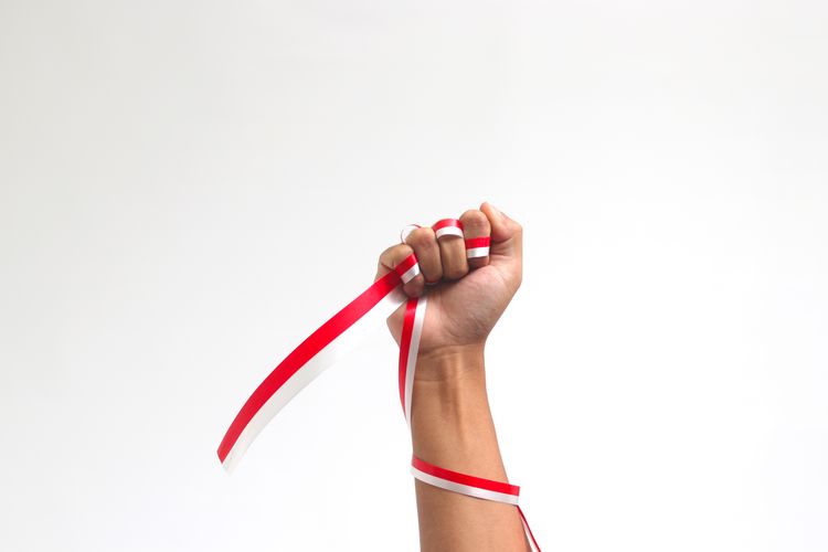Ilustrasi Hari Pahlawan, tangan menggenggam pita berwarna bendera merah putih.(SHUTTERSTOCK/JAMALUDIN YUSUPP)