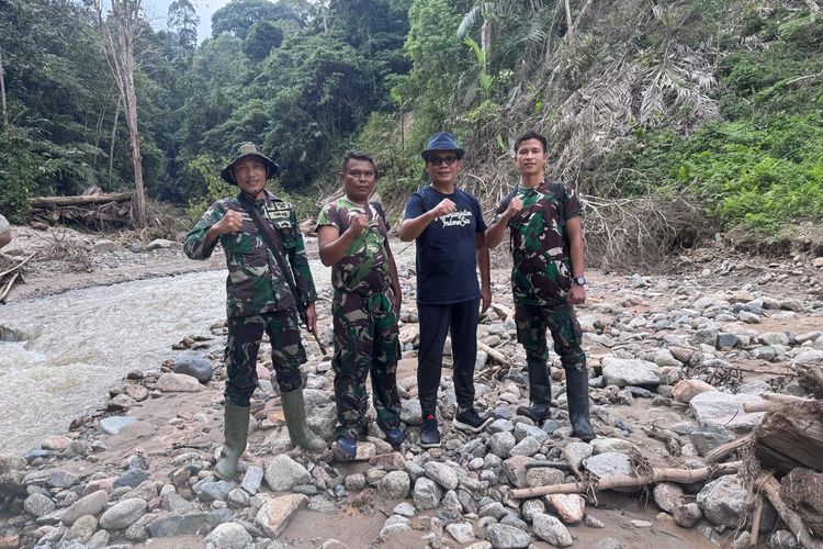 Wasekjen PBNU Rahmat Hidayat Pulungan (kedua dari kanan) saat menelusuri hulu Sungai Aek Siondop dan Aek Sibontar di Kecamatan Sayur Matinggi Tapanuli Selatan, Sumatera Utara, Senin (5/1/2026).