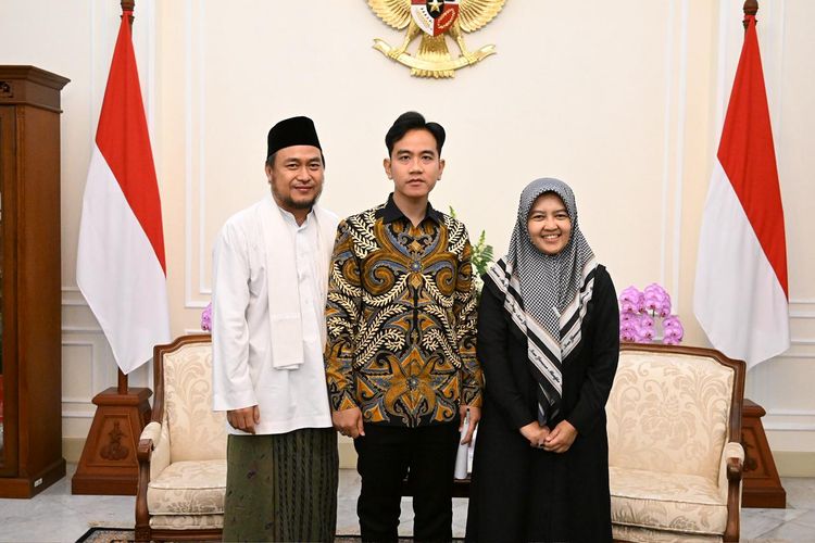 Wakil Presiden Gibran Rakabuming Raka bersama ketua panitia kunjungan ke Ponpes Cipasung, Hj Neng Irma Ruhyati (kanan) dan suami Neng Irma Ruhyati, KH Deni Sagara (kiri) di Istana Wapres, Jakarta, belum lama ini.
