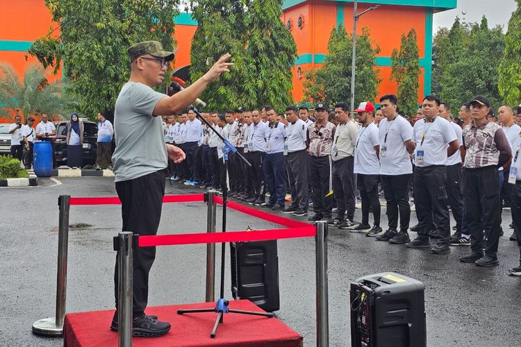 Wakil Menteri Haji dan Umrah Republik Indonesia Dahnil Anzar Simanjuntak memimpin apel calon petugas haji 2026 di Asrama Haji Pondok Gede, Jakarta Timur, Sabtu (24/1/2026).