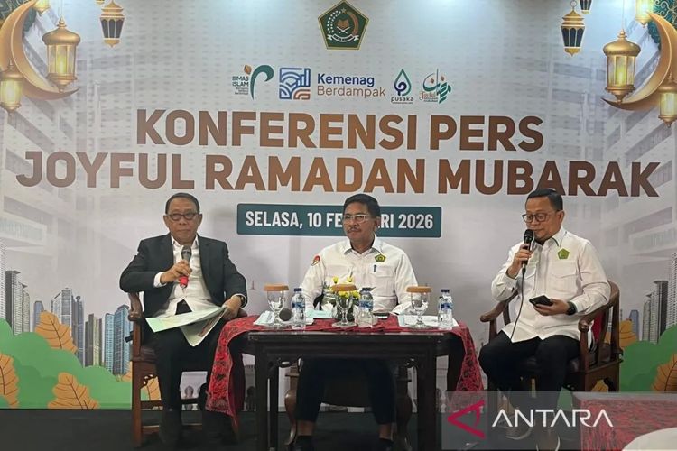 Direktur Jenderal Bimas Islam Kemenag Abu Rokhmad (tengah), Staf Khusus Menteri Agama Ismail Cawidu (kiri), dan Kepala Biro Humas dan Komunikasi Publik Thobib Al Asyhar (kanan) dalam konferensi pers Joyful Ramadan di Jakarta, Selasa (10/2/2026). (ANTARA/Asep Firmansyah)