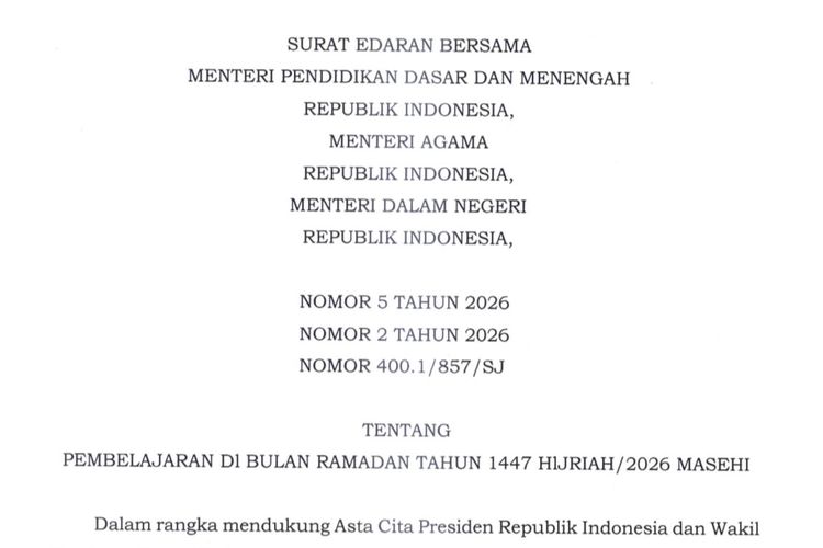 Surat Edaran Bersama (SEB) tentang Pembelajaran di Bulan Ramadan Tahun 1447 Hijriah/2026 Masehi.