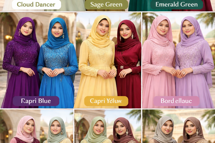 Tren warna baju Lebaran 2026 wanita: Cloud Dancer, Sage Green, Emerald Green, Rapri Blue, Capri Yellow, Bord ellouc, Pink & Burgundy, Sage & Butter Yellow, dan Mauve Mocha & Gold.