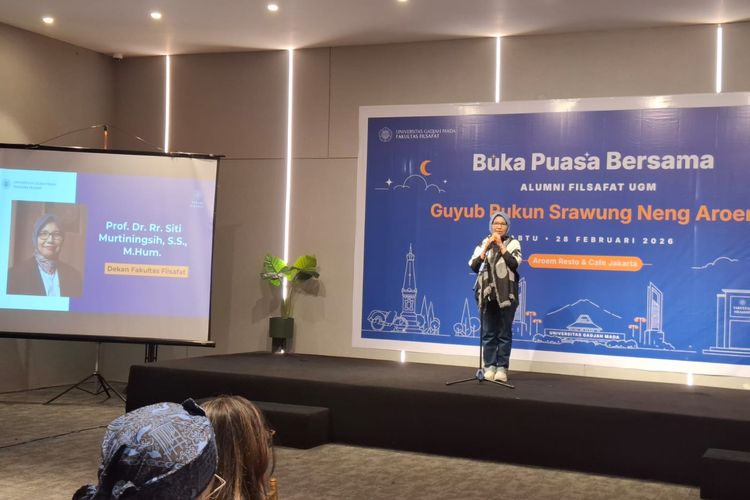 Dekan Fakultas Filsafat Prof Dr Rr Siti Murtiningsih SS MHum saat menyampaikan testimoni John Tobing, pencipta Lagu Darah Juang dalam acara Bukber Filsafat UGM di Aroem Resto & Ballrom Jakarta, Sabtu (28/1/2026) malam.
