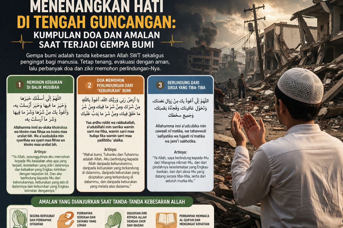 Berikut adalah beberapa doa yang dapat dipanjatkan saat menghadapi musibah gempa bumi: